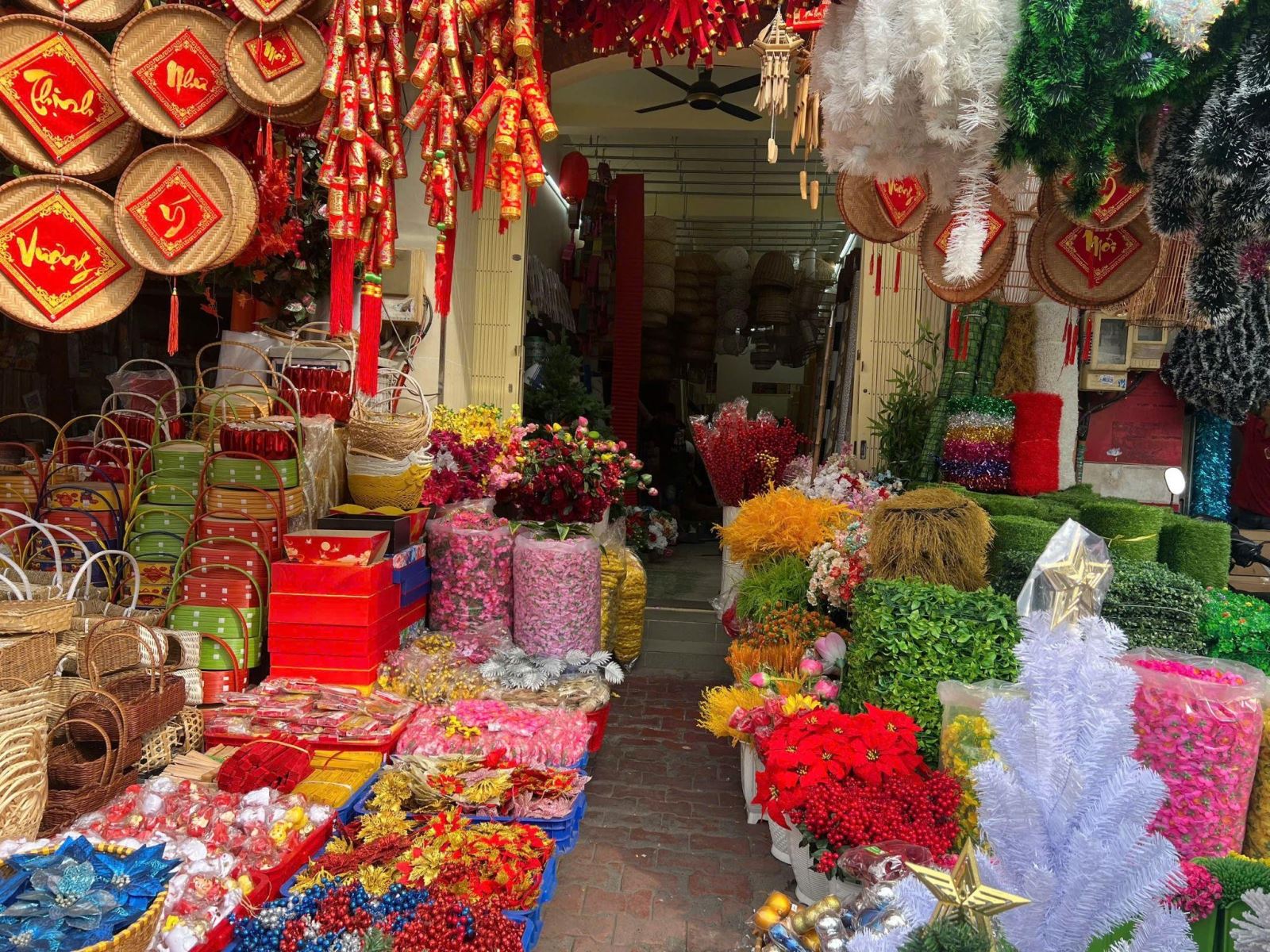 Đèn lồng Tết là phụ kiện gần như “không thể thiếu”. Có thể treo trước cửa, dọc lối đi hoặc khu vực quầy thu ngân. Ngoài ra, các loại dây treo chữ chúc Tết, đồng tiền vàng, pháo đỏ giúp tạo không khí xuân rõ rệt mà không chiếm nhiều diện tích.